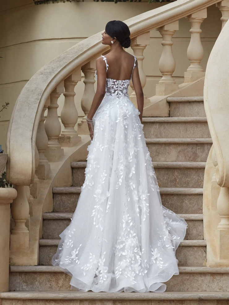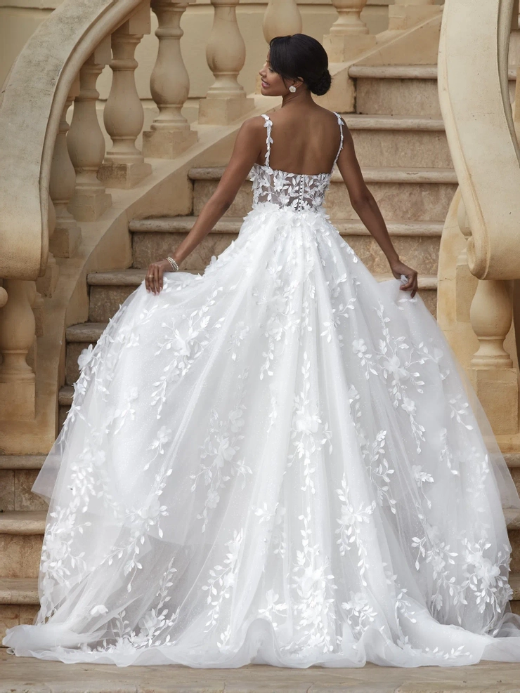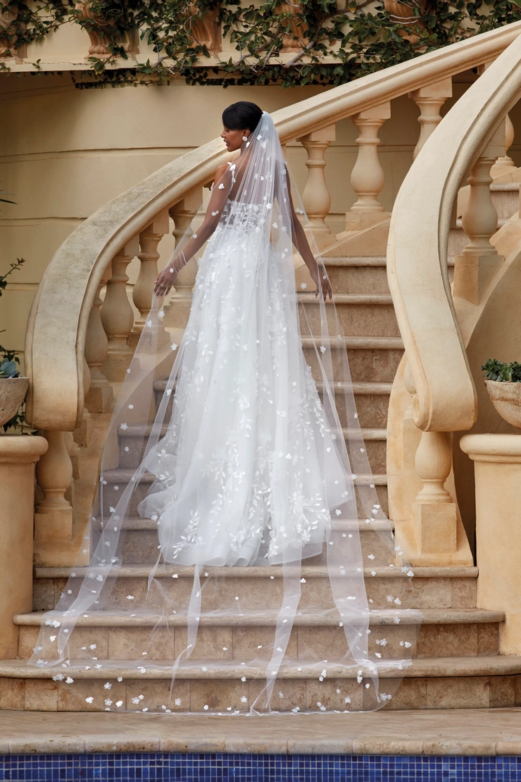 A botanical fusion of 3D flowers and beaded lace over shimmering tulle create this heavenly garden inspired design. Style 1223 features delicate floral straps on the the plunging sweetheart bodice and exquisite embellished, sheer back with buttons. An optional train offers a regal touch. Gown additions include detachable train and matching veil V274 (both sold separately).