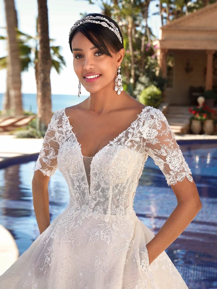 Classic romance and decadent luxury radiate in style 1237 with her quarter length sleeves and magnificent lace embellished plunging V-neck bodice and Ball gown skirt. A sexy low scoop and lush Chapel train add the perfect finish to the beautiful back.