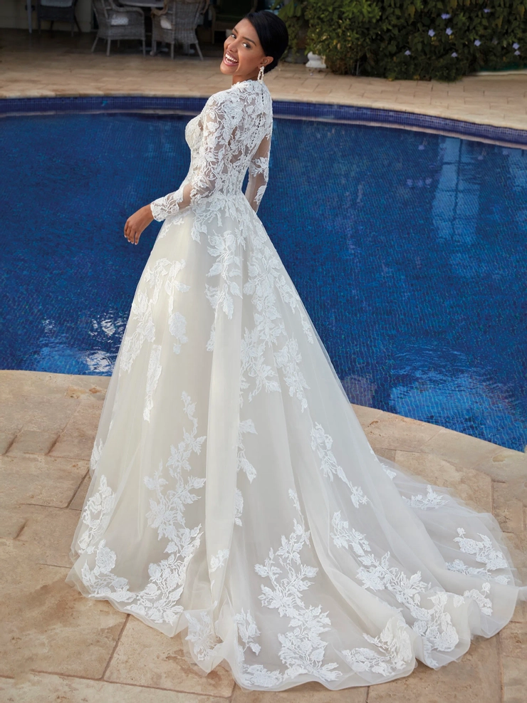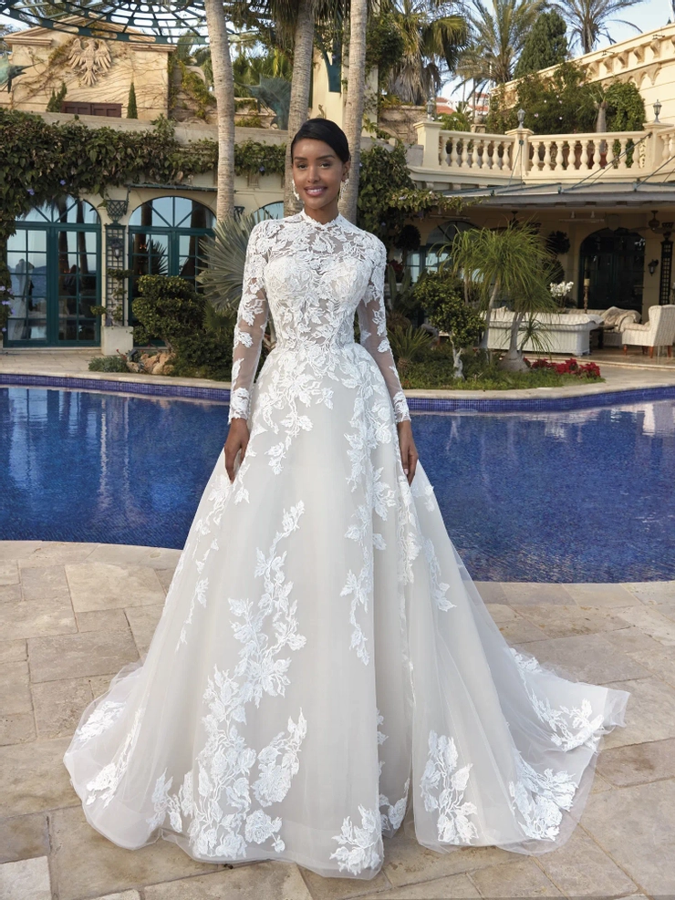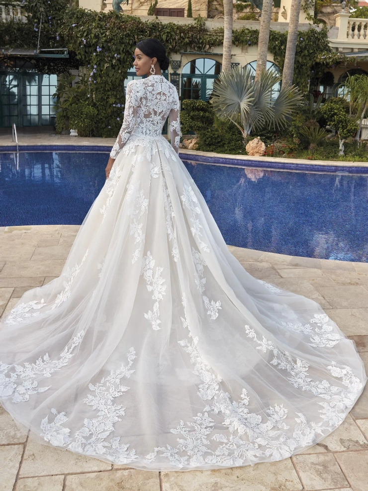Timeless beauty radiates in style 1241. Ornate, embroidered lace adorns her luxurious skirt and glamorous, high-neck, bodice with long sleeves and transparent detailing. An embellished detachable train adds a regal finishing touch. Matching detachable train (sold separately).