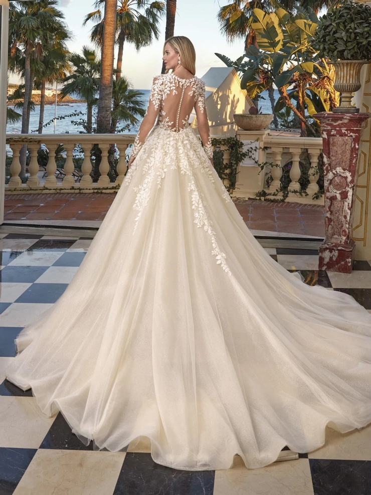 Classic opulence meets modern glamour in style 1247. This dreamy Ball gown is richly adorned with beaded lace over sparkling tulle and features a plunging V-neck bodice with long sheer sleeves and magnificent embellished illusion back with button closure.