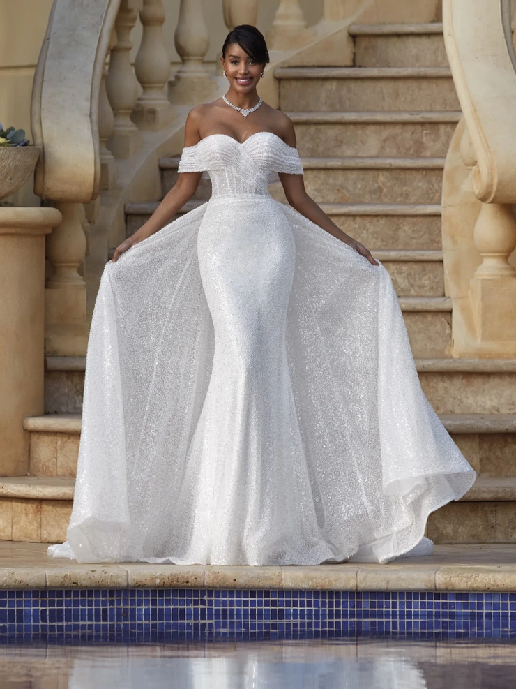 Beautiful style 1252 ties together modern, opulent luxury and dazzling, old world glamour with her shimmering sultry silhouette and seductive, asymmetrical, off-the-shoulder portrait neckline. A lavish detachable train adds the ultimate finishing touch. Matching detachable train (sold separately)