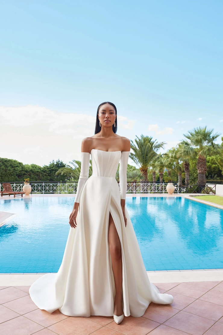 Simply alluring and luxurious with a touch of chic, style 200146 features a captivating, strapless, corset bodice with a soft scoop neckline and a lush A-line skirt with sexy slit. Removable gauntlet sleeves add the perfect unique touch. Available in Satin or Mikado