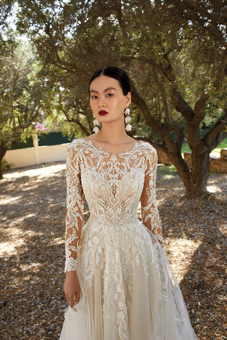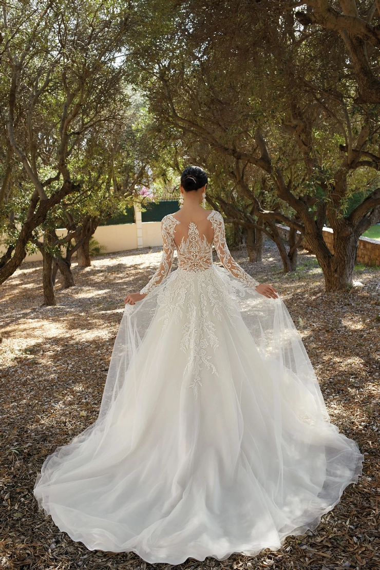 Style 200156 exudes classic ethereal opulence with a contemporary twist. An artistic blend of intricate lace and beading embellishes the sheer Bateau neck bodice and streams into the tulle, A-line skirt of this long sleeve beauty. A magnificent tattoo effect motif adorns the sheer back.