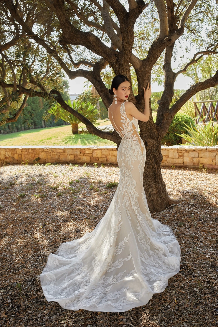Nothing short of stunning, style 200162 was designed for the bride desiring a classic look with opulent modern detailing. Ornate, intricate beaded lace adorns the plunging illusion v-neckline and sultry form fitting skirt. The exquisite sheer back features sprays of lace and a button closure.
